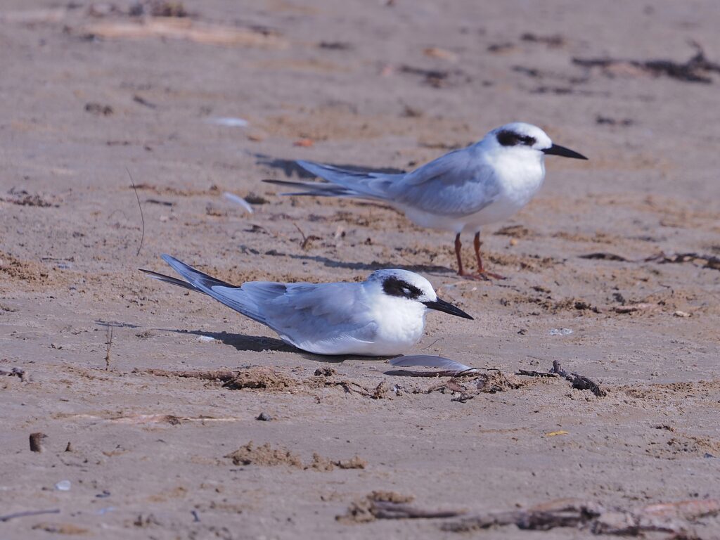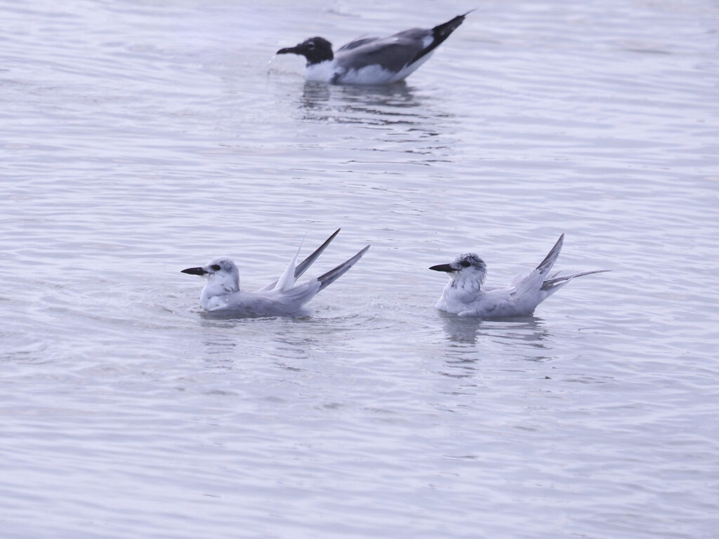 The Gull-billed Tern is much smaller than the Sandwich, but slightly larger than Forster’s and Common. It’s named for its bill which is thick and black. The Gull-billed is uncommon, but regular on the Texas Coast where it frequents sand flats and grassy marshes year-round, swooping low to snatch prey from the water or ground surface.