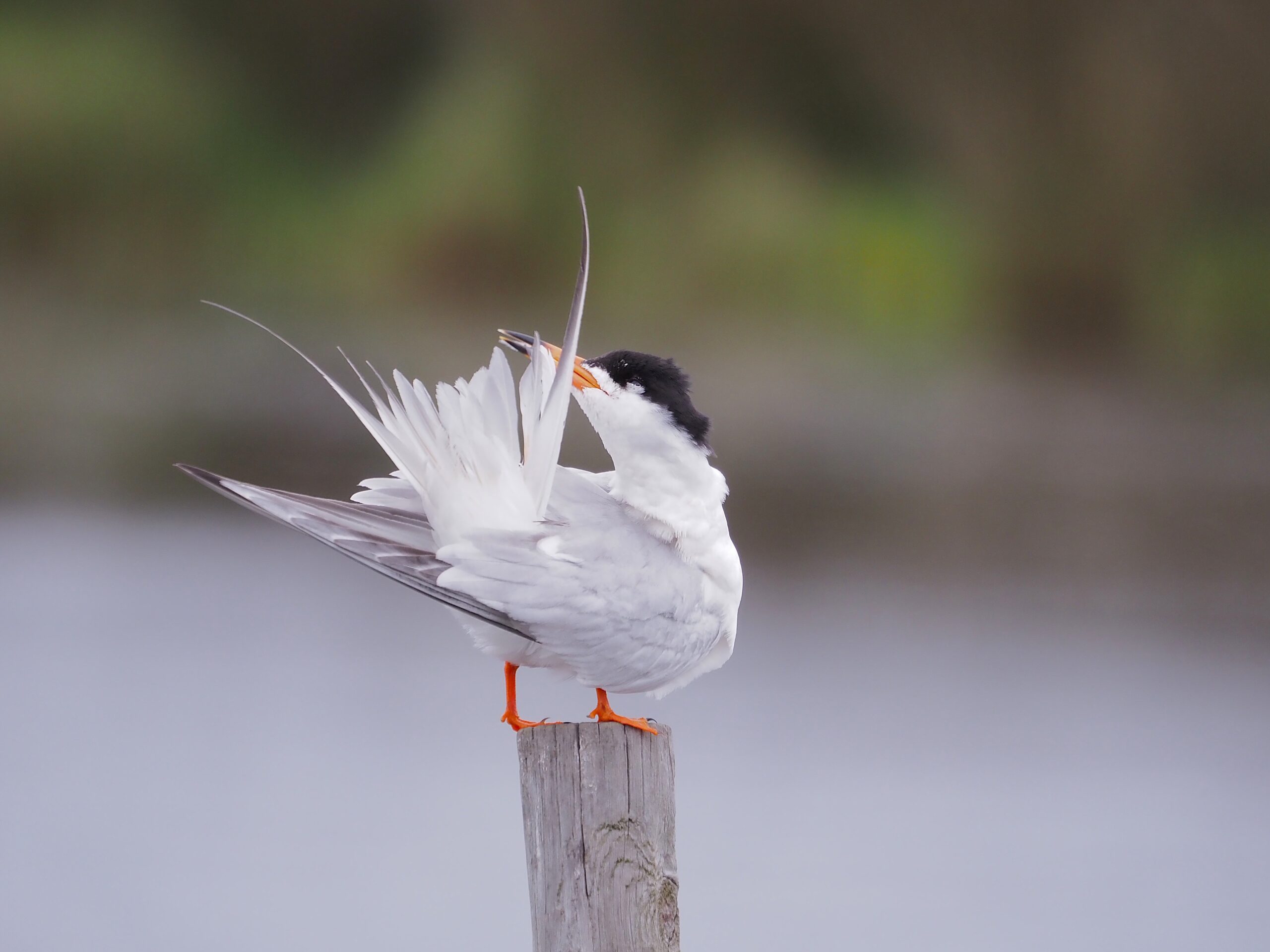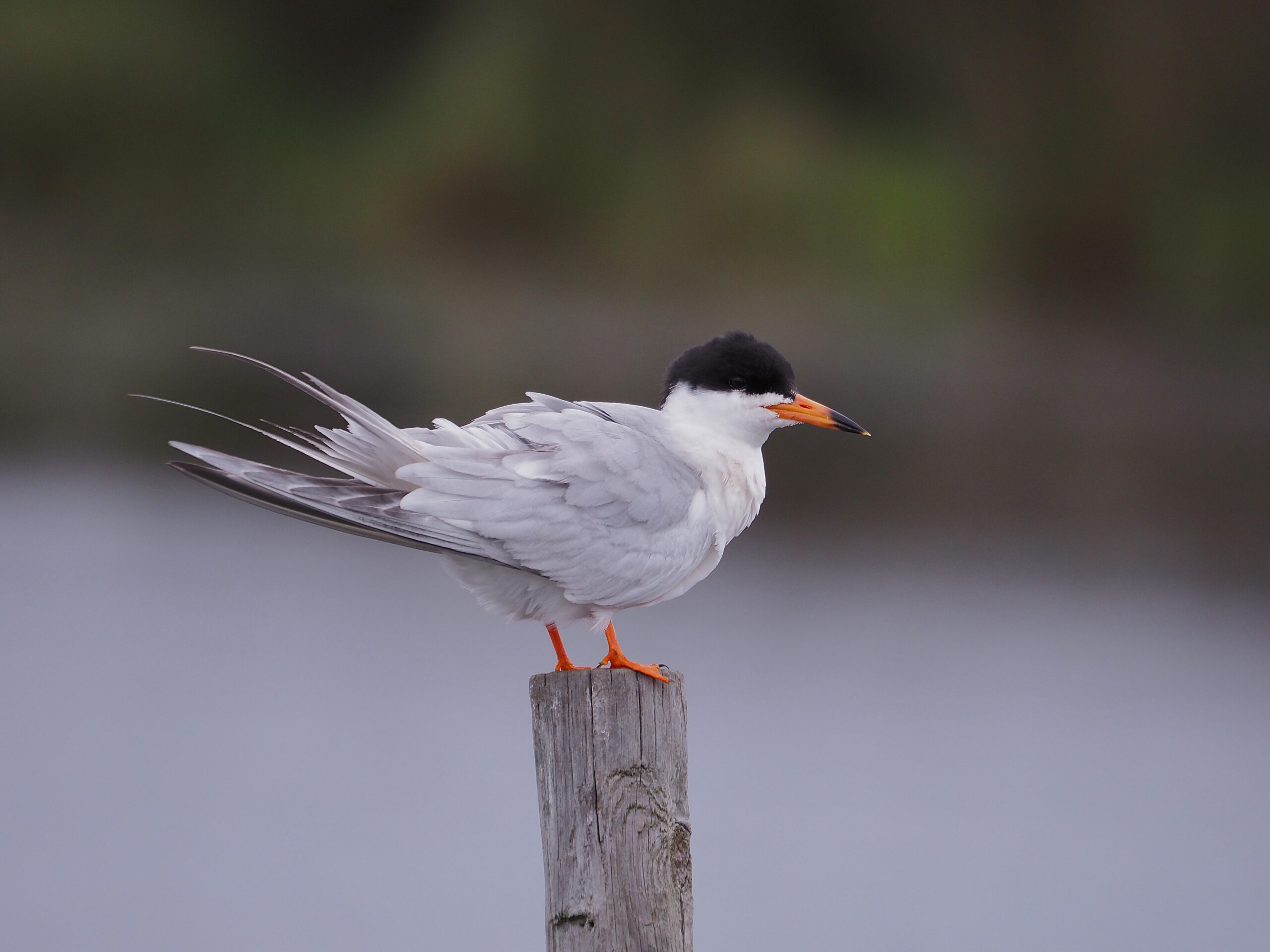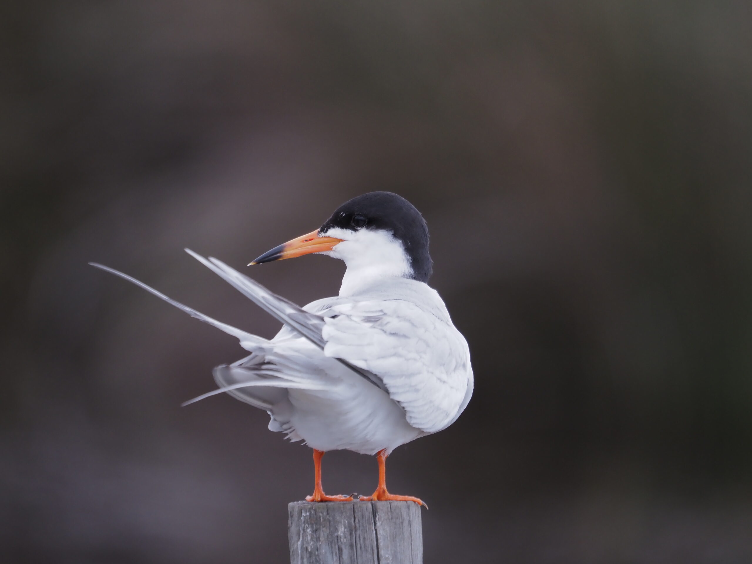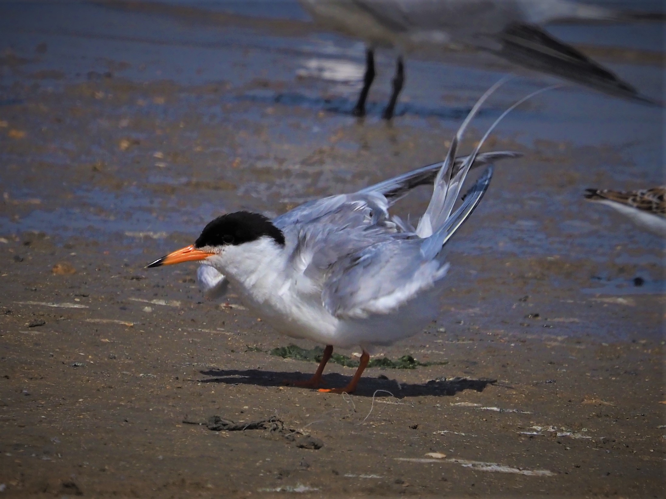 With its bright orange & black bill, orange legs, black cap and long streamer tail the Forster’s in alternate plumage is spectacular when seen well!! Note that the streamer tail usually extends past the primaries.