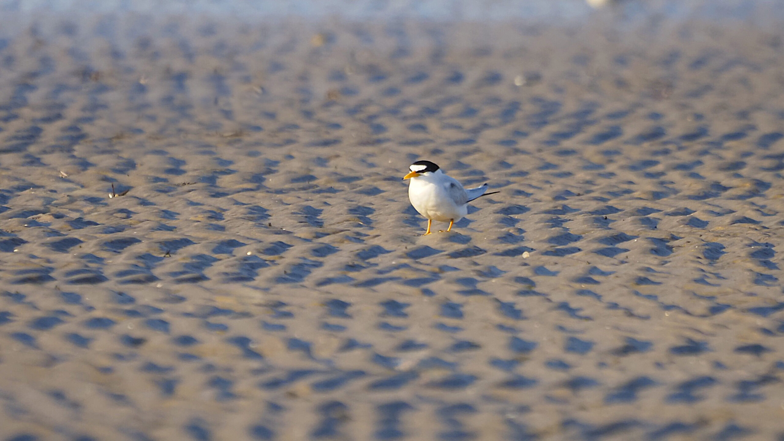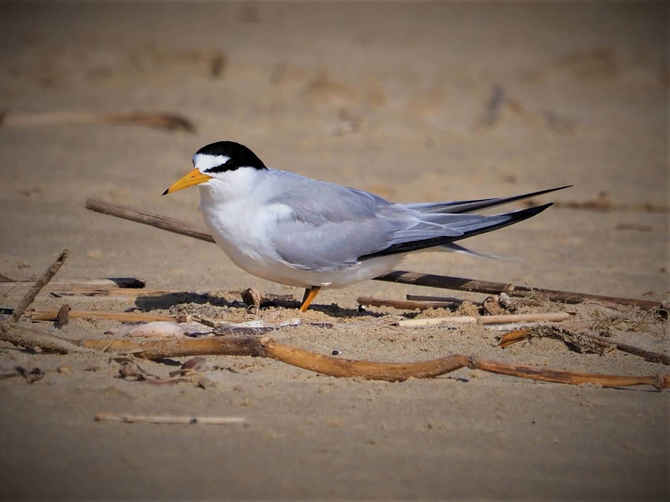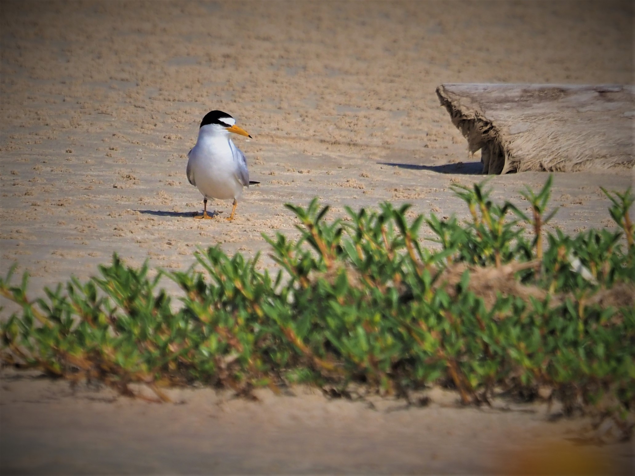 The Least Tern is the smallest in the world. It is a summertime breeder on the Texas Coast and is seldom seen in Texas in winter. In alternate plumage it sports a white forehead and a yellow bill with a black tip — the only tern present in Texas to do so. In basic plumage the Least has an all-black bill. Once the eye is calibrated it is not difficult to identify this small, fluttering flyer as it dives in, usually fairly shallow water.