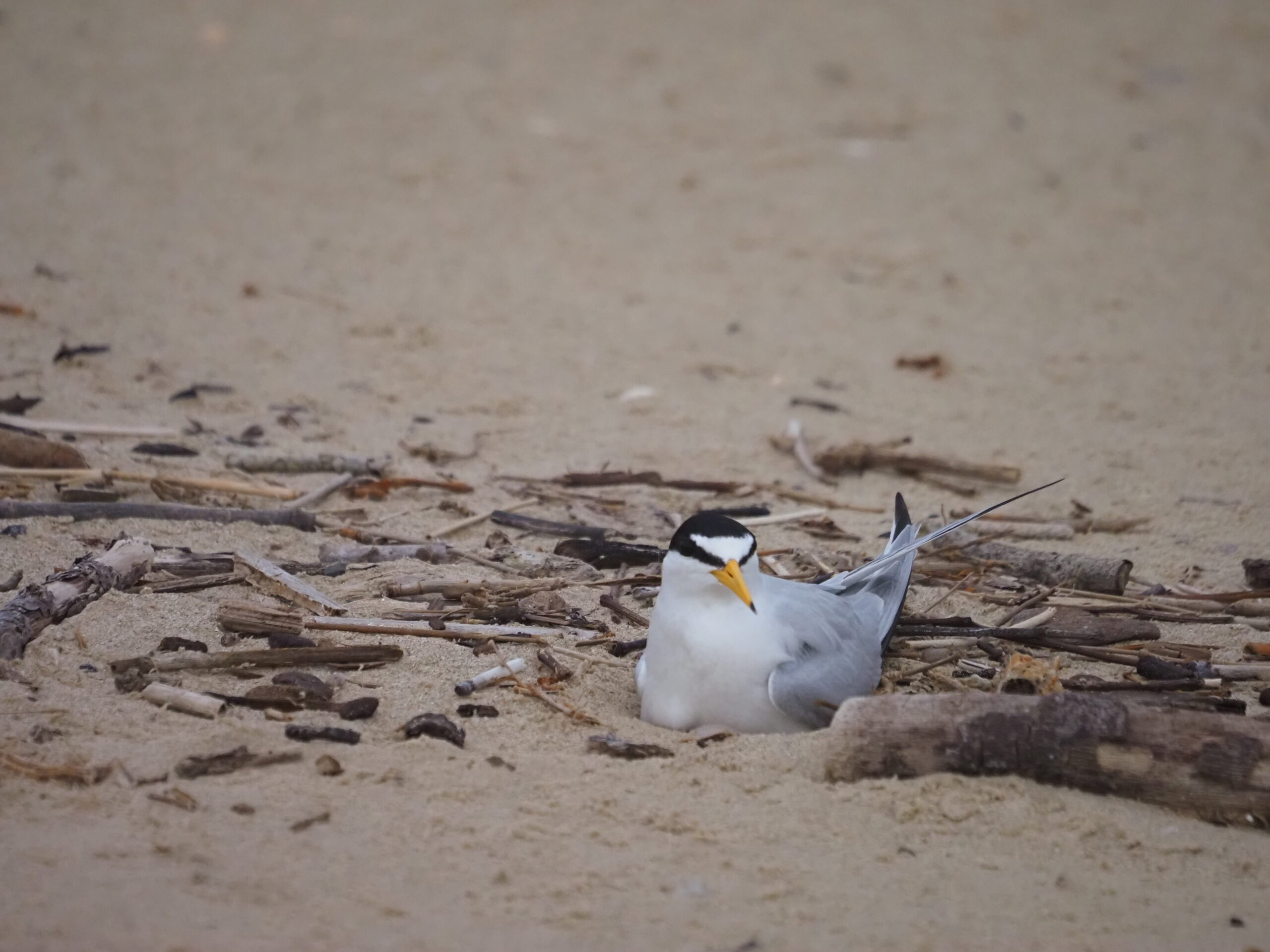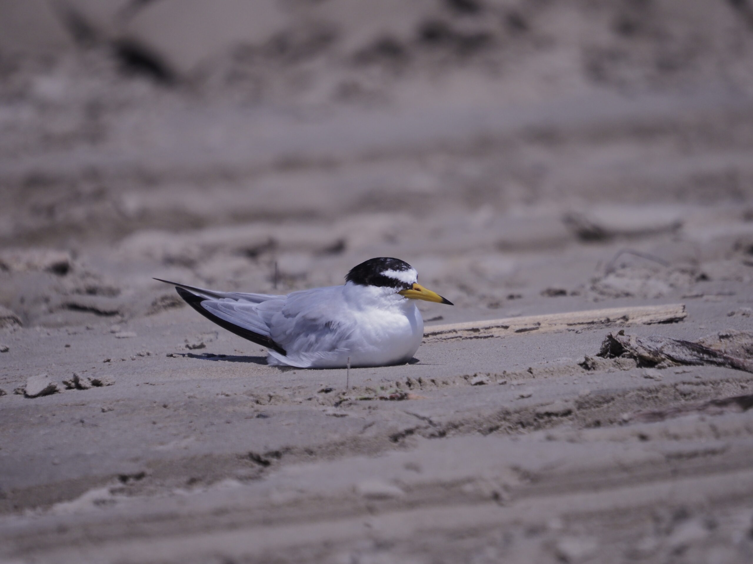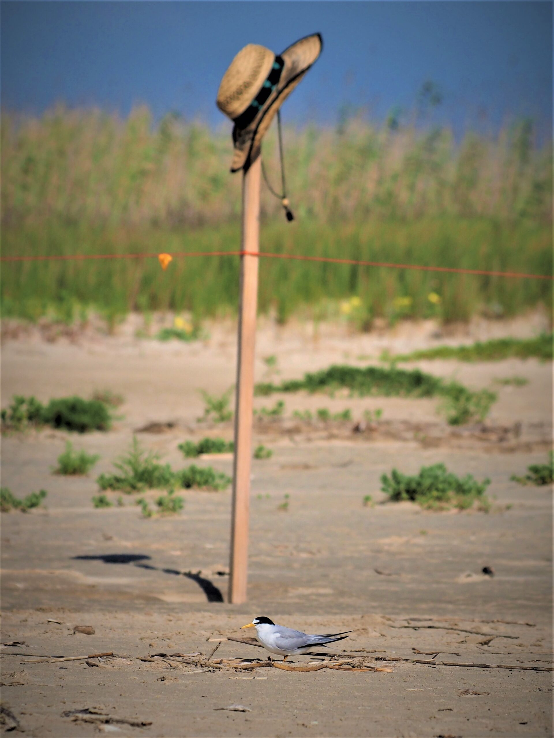 The Least Tern is the smallest in the world. It is a summertime breeder on the Texas Coast and is seldom seen in Texas in winter. In alternate plumage it sports a white forehead and a yellow bill with a black tip — the only tern present in Texas to do so. In basic plumage the Least has an all-black bill. Once the eye is calibrated it is not difficult to identify this small, fluttering flyer as it dives in, usually fairly shallow water.
