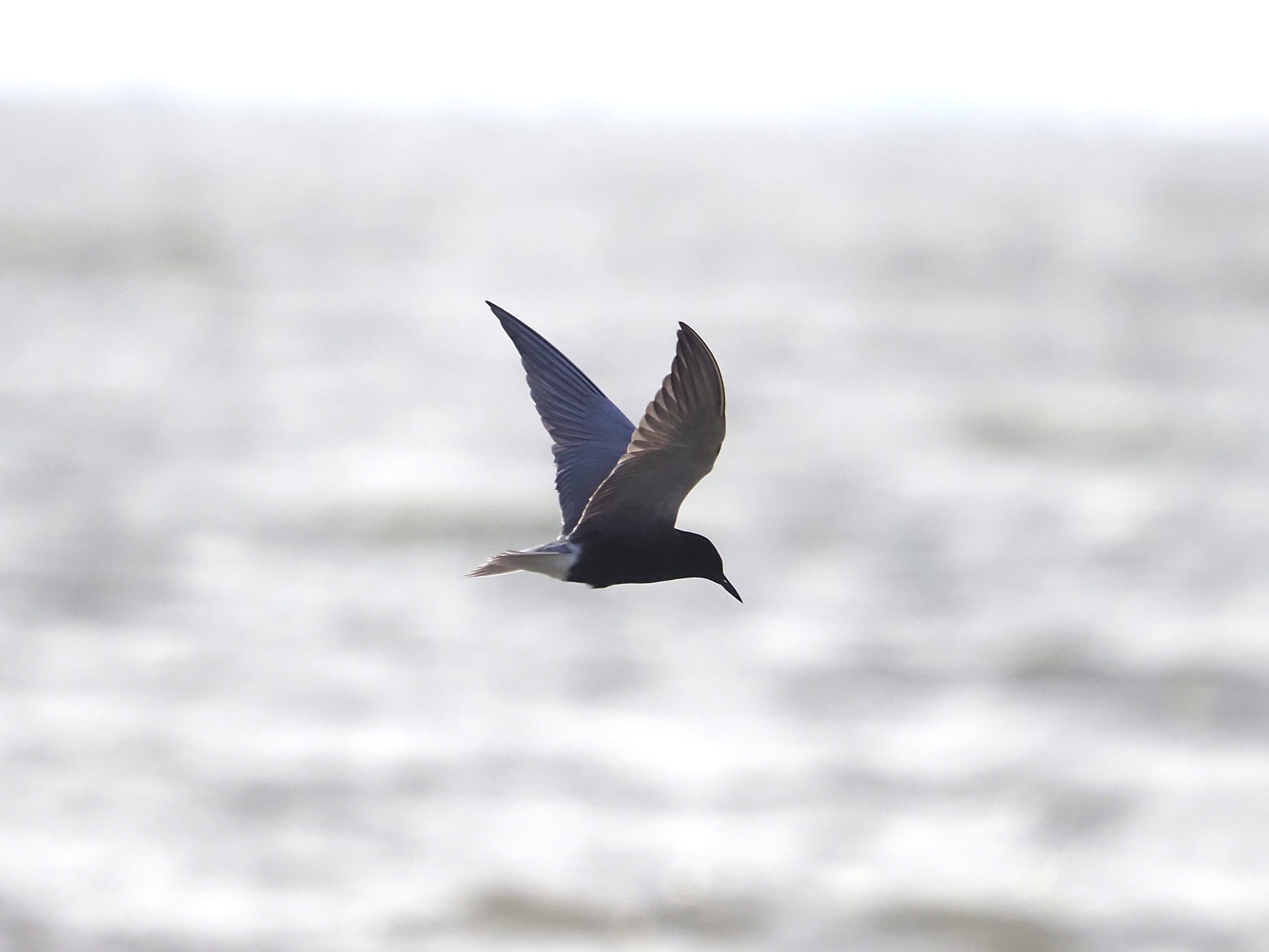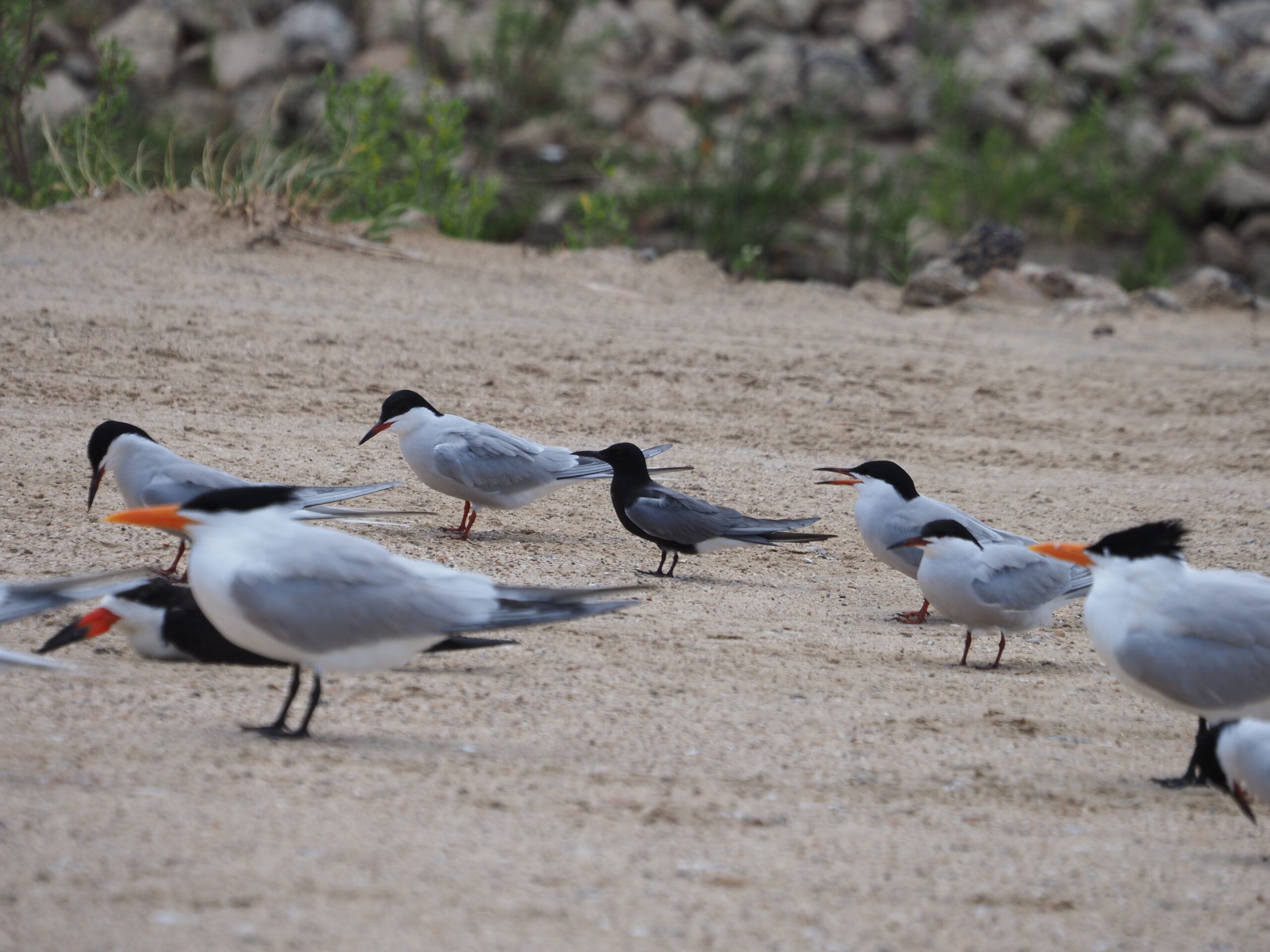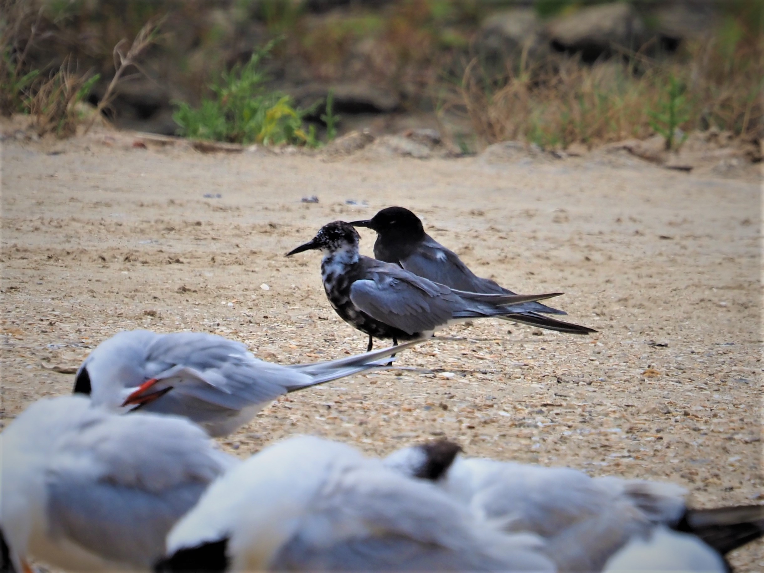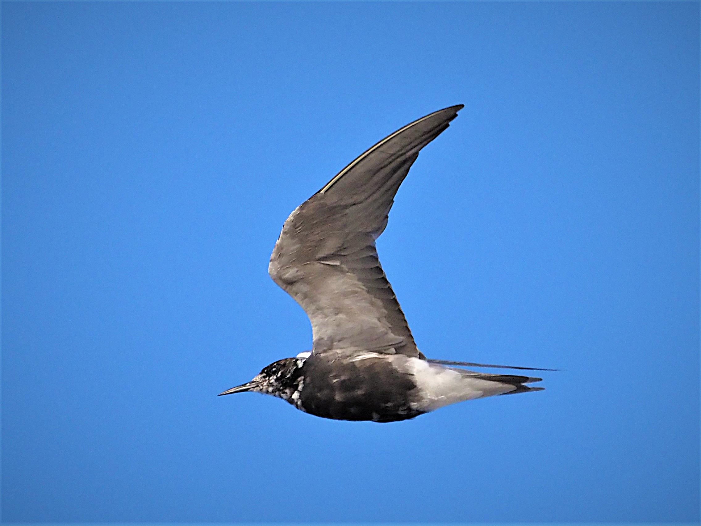 The Black Tern is smaller than the medium terns and only slightly larger than the Least Tern. It is migrant through much of Texas in fall and spring and can show up at inland locations, but is more numerous on the coast. In full alternate plumage it has a black body, charcoal gray wings and white vent & undertail coverts. In migration it often seems to be in plumage transition so I call it “the splotchy, black migrant”. With its long wings and buoyant flight it is not a difficult identification. The Black Tern most commonly feeds by picking food items from the surface of water, but also hunts insects in mid-air. In migration 1,000s may be seen at coastal spots.