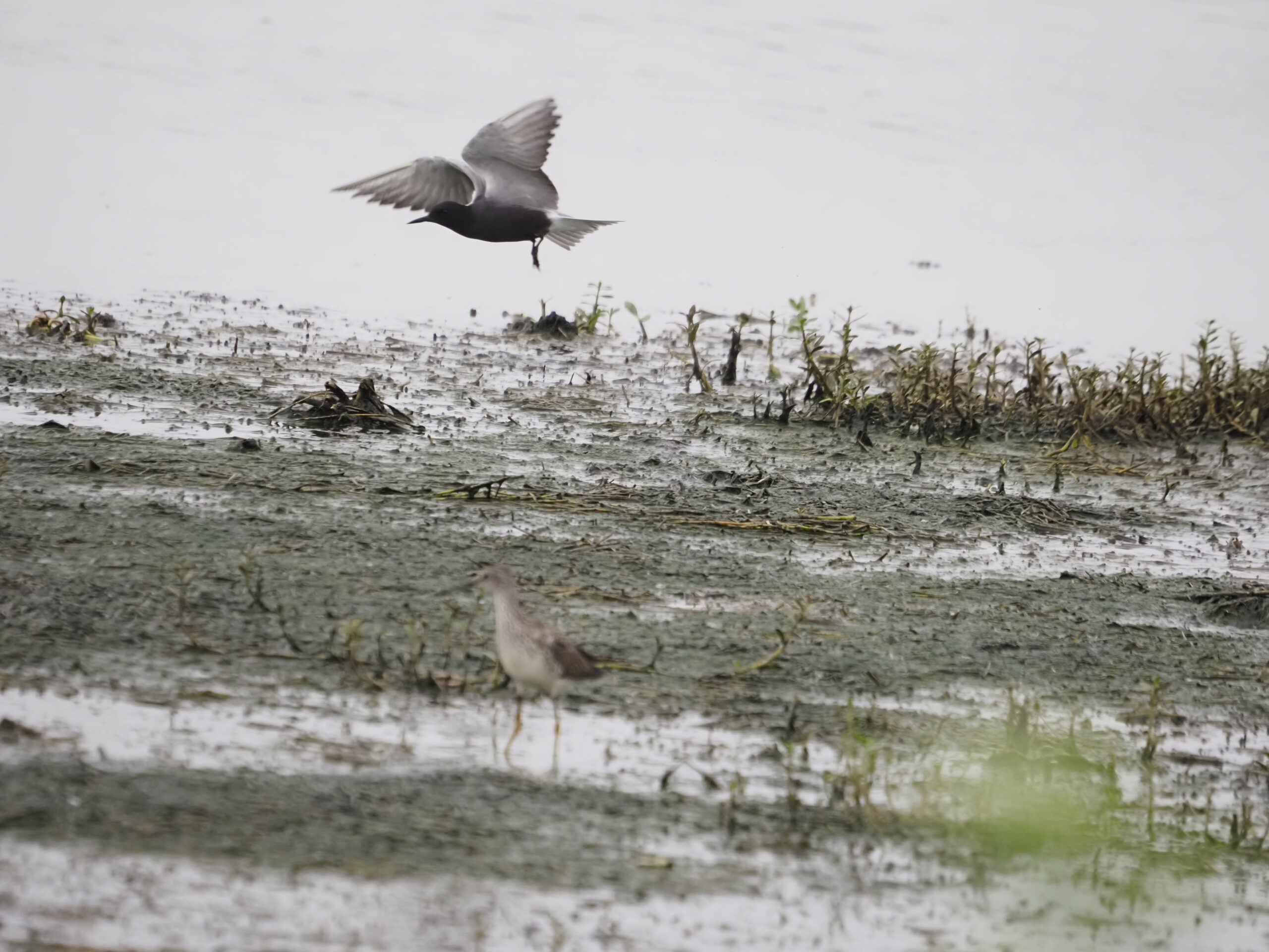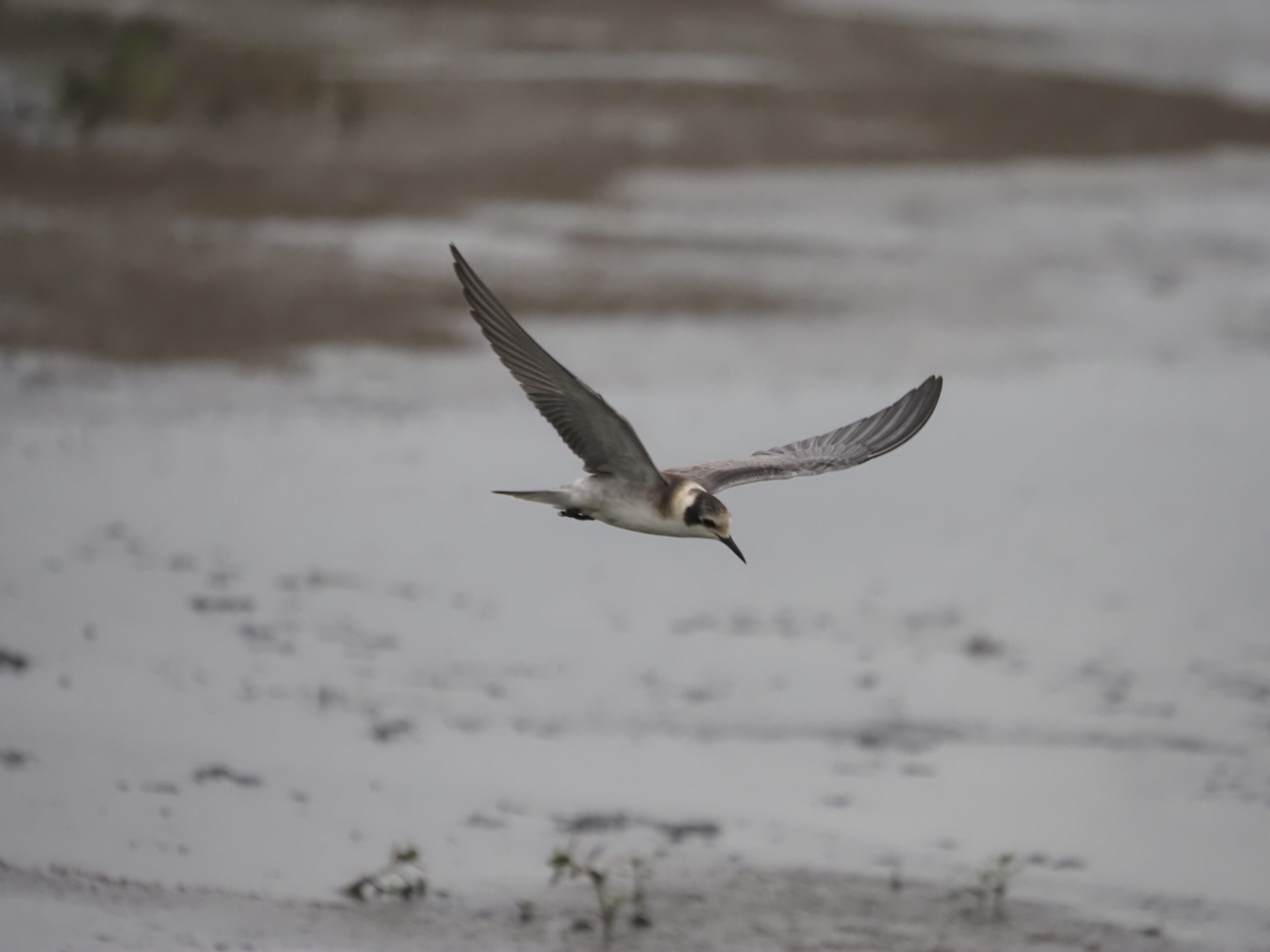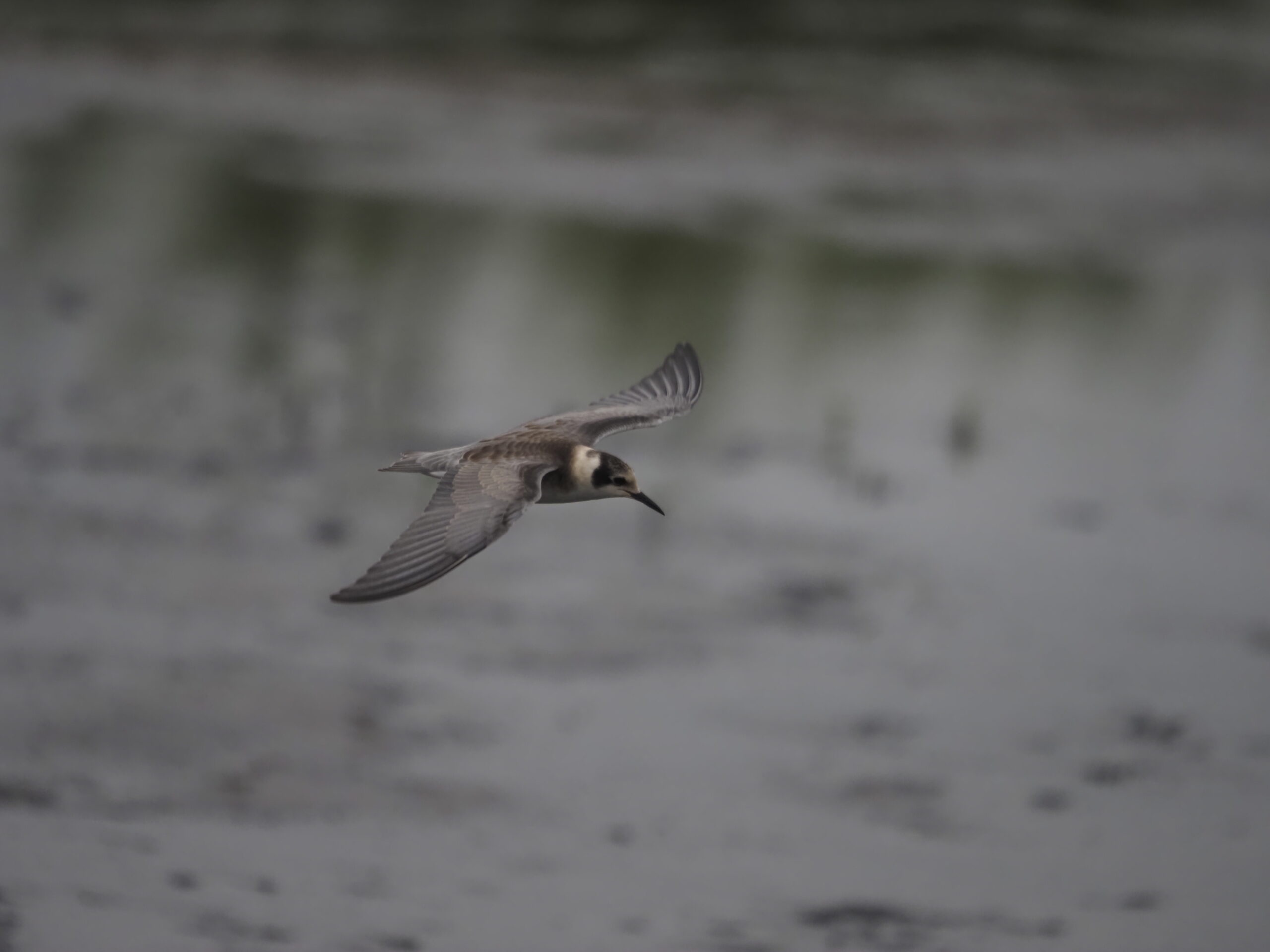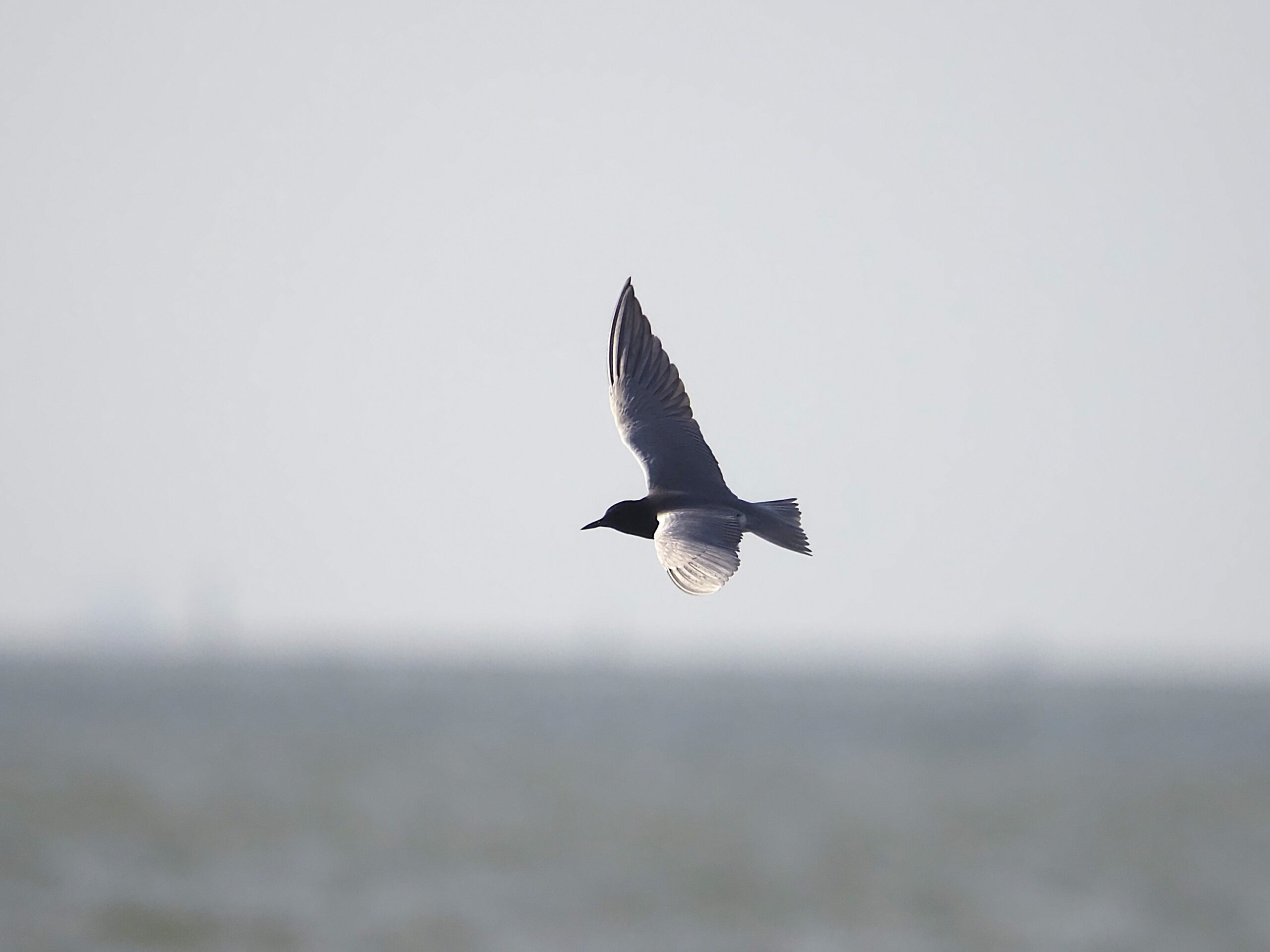 The Black Tern is smaller than the medium terns and only slightly larger than the Least Tern. It is migrant through much of Texas in fall and spring and can show up at inland locations, but is more numerous on the coast. In full alternate plumage it has a black body, charcoal gray wings and white vent & undertail coverts. In migration it often seems to be in plumage transition so I call it “the splotchy, black migrant”. With its long wings and buoyant flight it is not a difficult identification. The Black Tern most commonly feeds by picking food items from the surface of water, but also hunts insects in mid-air. In migration 1,000s may be seen at coastal spots.