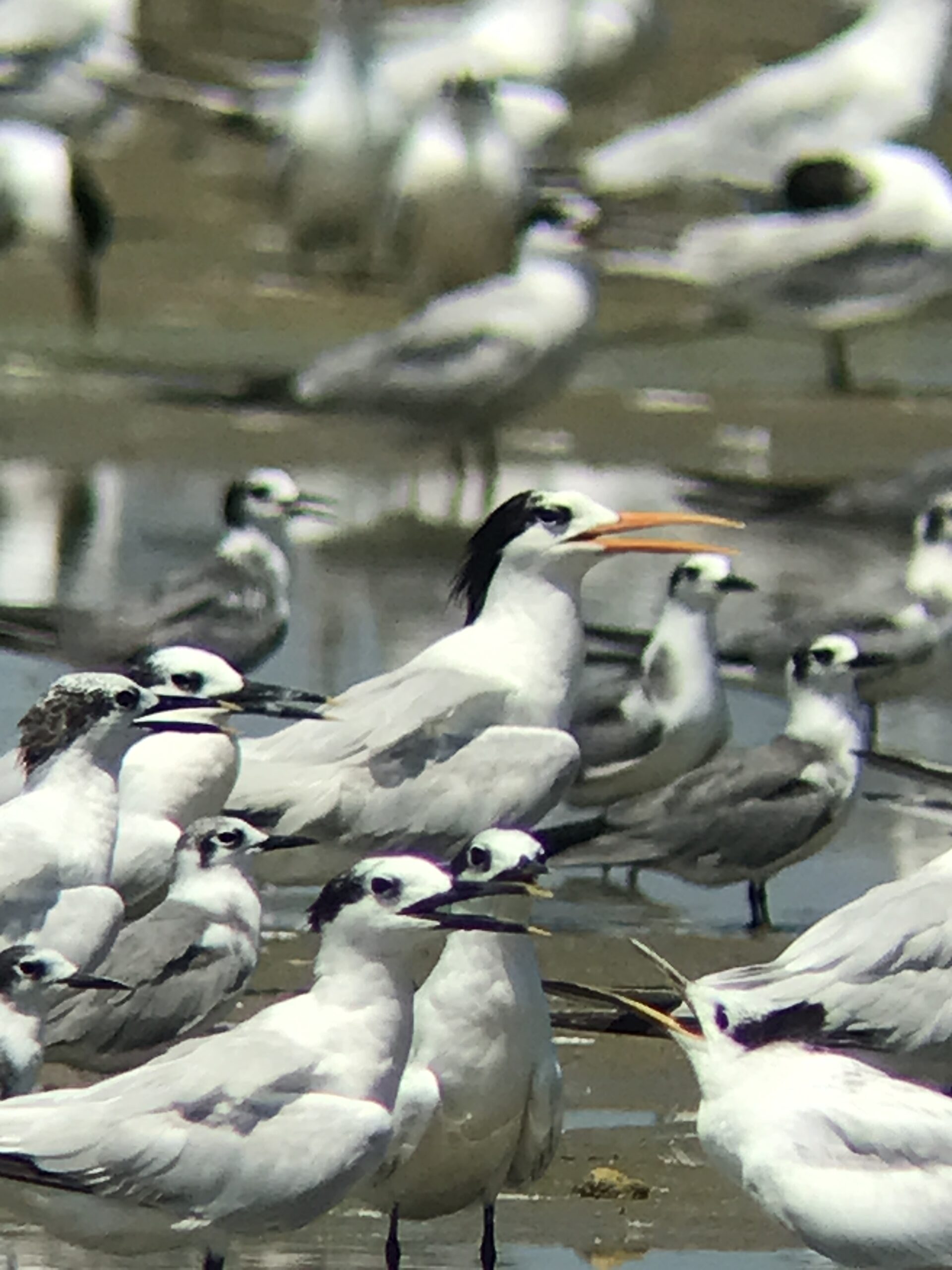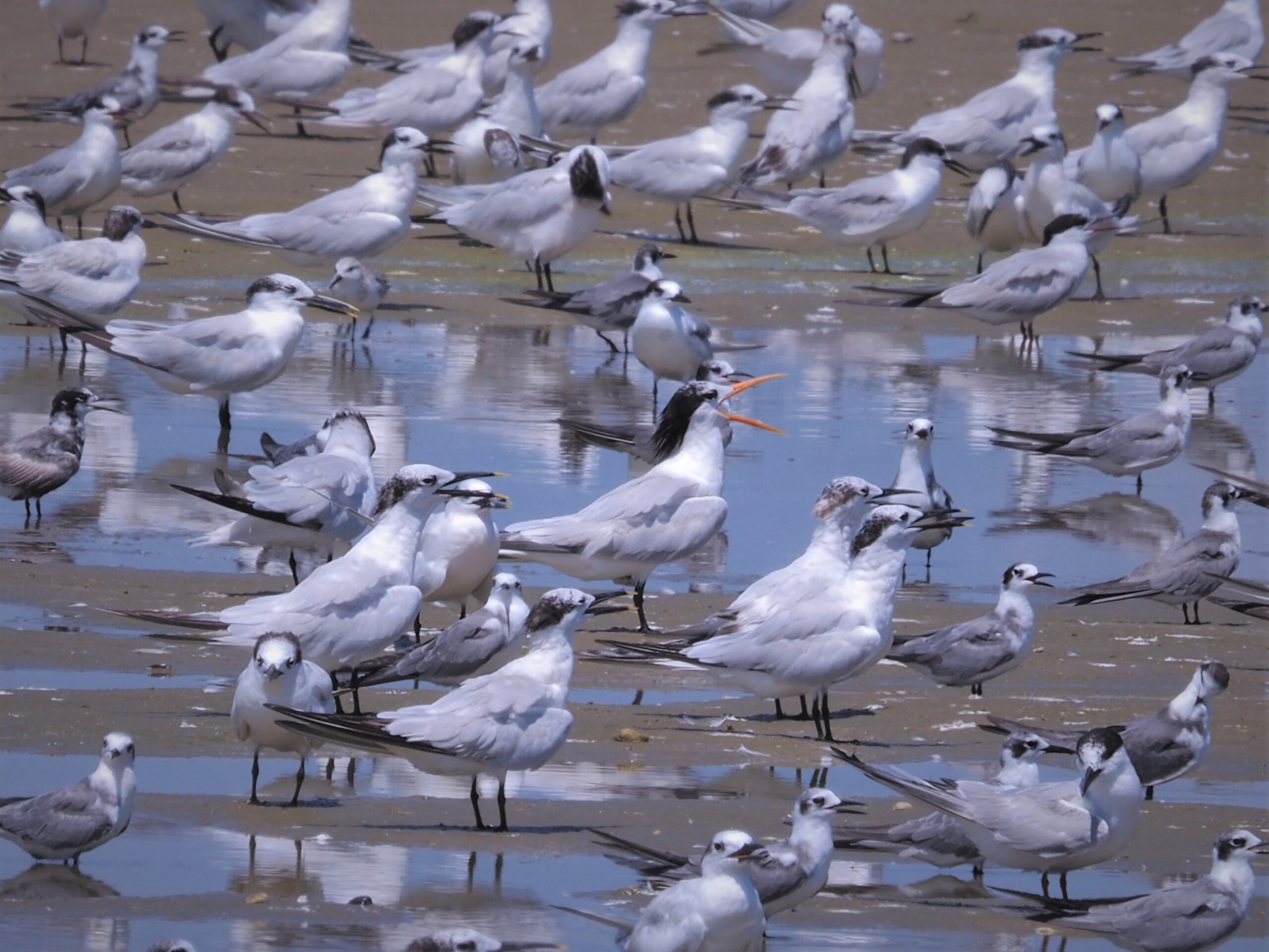In September of 2022 the Travis Audubon Shorebird Class was treated to a sighting of an Elegant Tern at the Port Aransas jetty. The Elegant has a very long and slender slightly down-turned orange bill and a rather spikey black crest in back.