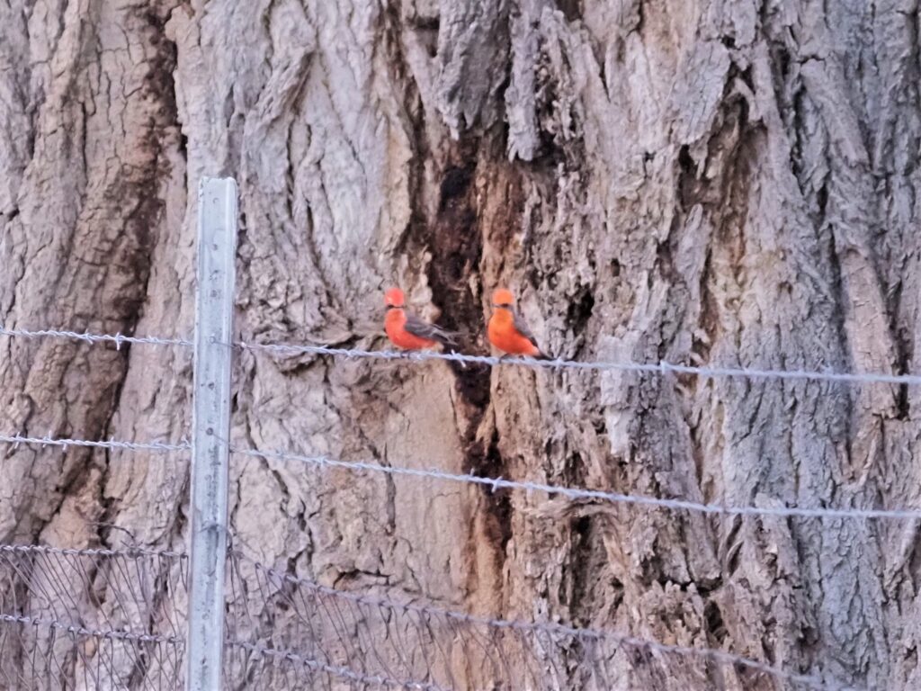 Here’s a couple of pix I thought a little unusual. 2 male Vermillions on territory but amicably sitting close together — Maybe family?